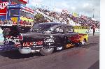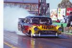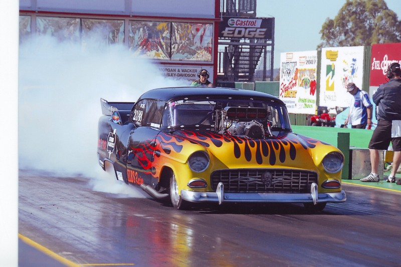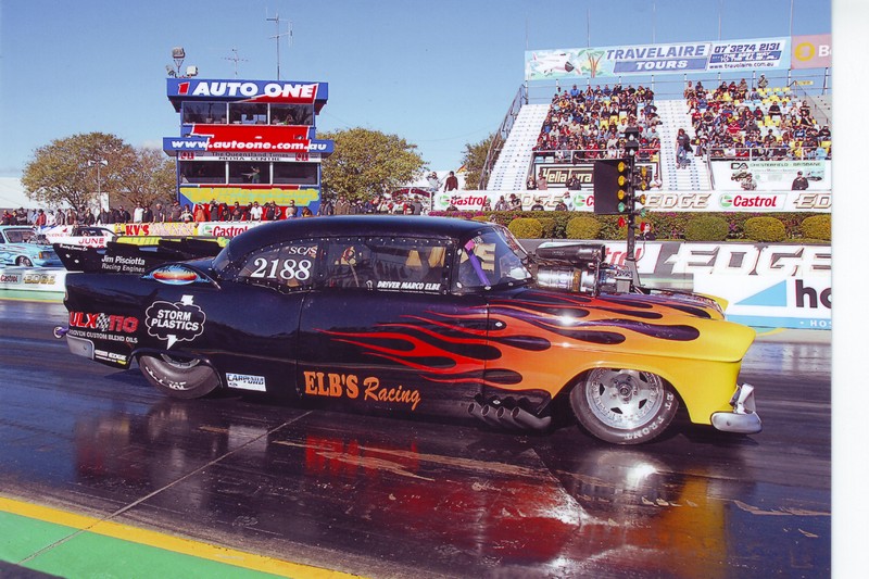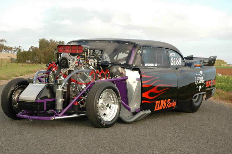 | 1955 Chev Coupe Engine: 526ci Hemi, built by Jim Pisciotta Race Engines, LA Billet crank, Brooks billet rods, Arias pistons, Akerly & Childs Xtreme rings, Crane camshaft, Manton pushrods, Comp Cams lifters, Stage 5 rockers, Manley valves and valve springs, RCD Engineering dry sump oil pump, Stage 5 intake manifold, custom carbon fibre hat, 14/71 high helix retro blower by The Blower Shop @, custom headers by 2H Automotive, MSD 44-amp magneto, V300 Racepak Data logger, Jim Pisciotta custom aluminum rocker covers, ELB's Racing custom billet work. Transmission: Lenco – 3 Speed Lencodrive with airshift. Diff: Terry’s Race Car chrome moly sheet metal housing, Strange Diff centre, with floating 35 spline Strange axles. Suspension: Front - McLeod Chassis Struts. Rear – AVO coilovers. Brakes: Front – Wilwood 2-spot calipers with ELB’S Racing custom discs. Rear – Wilwood 4-spot calipers / Twin Simpson Drag Parachutes. Wheels / Tyres: Front: Centreline Convo Pro 15x4½”, MT 24x5½” ET Front runners. Rear: Weld Racing Wheels beadlock, 34½”x17”x16” MT ET Drag. Body: Custom McLeod Chassis, with fibreglass guards and front clip. Painted in Black with Lilac Pearl with custom flame graphics. ELB's Racing custom fabrication and billet work. Best ET / MPH : 7.10 @ 196mph. 1320ft (¼ mile) |